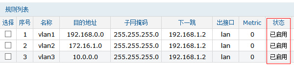 同样的方式,添加其它网段的静态路由规则,设置完成后,总规则如下: