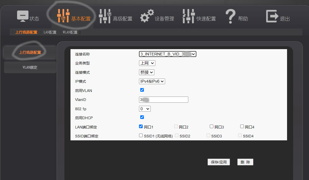 2.2,依次点击“基本配置”→“上行线路配置”,点击“连接名称”下拉菜单,选择新建连接,类型选择Internet连接,选中“启用/关闭”复选框,连接模式选择“桥接”,服务类型选择“Internet”,选中“启用VLAN”复选框,VLAN ID设置输入“你刚才记下的VLAN ID”,802.1p优先级设置输入“0”,Lan端口绑定选择“Lan1”即可,因为其他口都是百兆,也没有替换的意义。WAN协议版本选择“IPV4&IPV6”(因为网心、京东等部分业务可能会用到IPV6),最后点击“确定”。